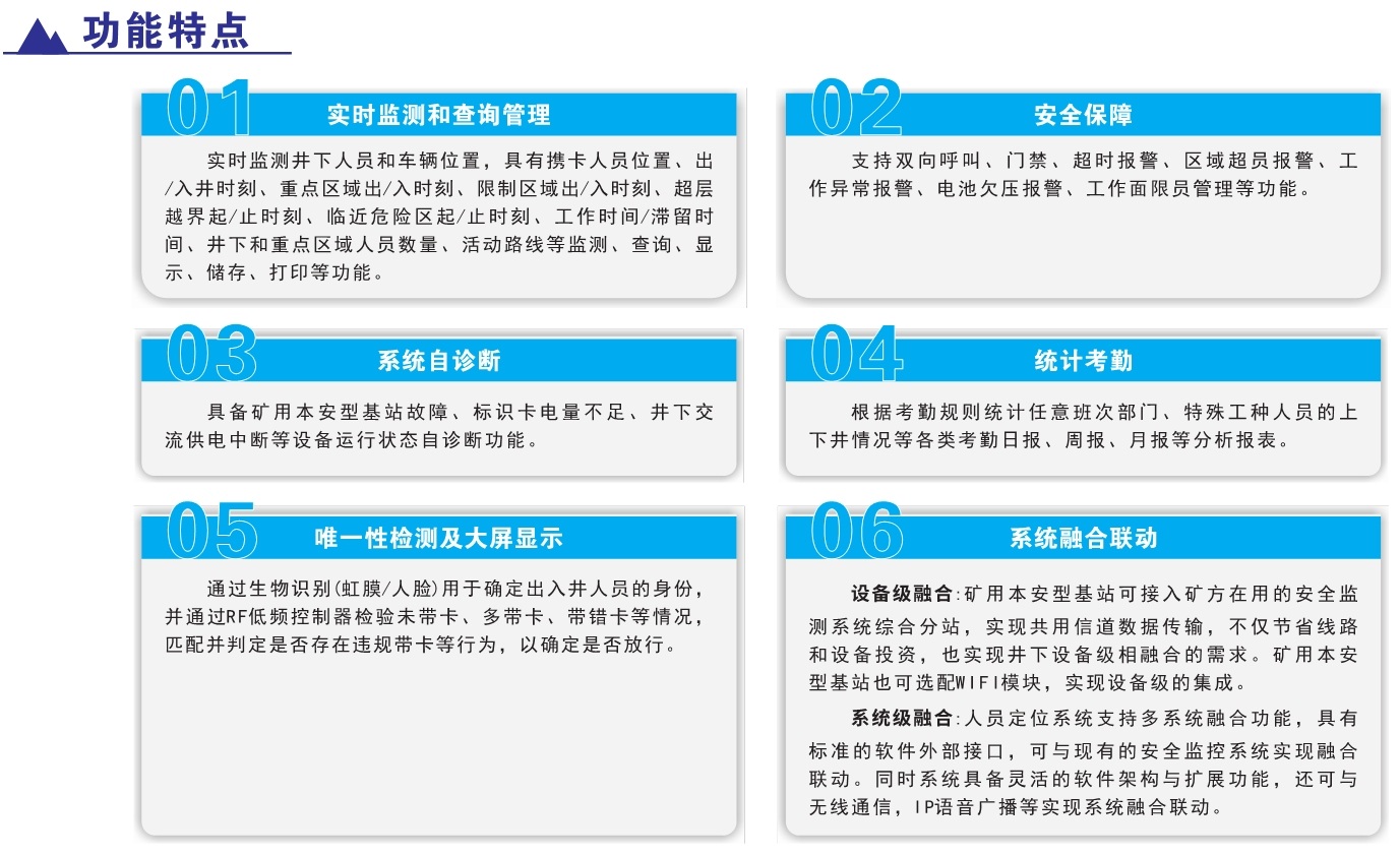 產(chǎn)品簡介:KJ2356J煤礦井下人員精確定位系統(tǒng),采用超寬帶無線(UWB)、慣性測量單元(IMU)、到達(dá)時差法(TODA)等多源融合定位方法,實(shí)現(xiàn)井下移動目標(biāo)定位精度小于0.3米的井下類GPS系統(tǒng)。該系統(tǒng)不僅強(qiáng)化了人員位置的精準(zhǔn)感知,實(shí)現(xiàn)煤礦井下作業(yè)人員位置的監(jiān)測管理、報(bào)警、各類數(shù)據(jù)查詢及報(bào)表功能。同時支持與車輛定位融合,將精準(zhǔn)定位技術(shù)應(yīng)用到井下機(jī)車、采掘裝備等各類設(shè)備。該系統(tǒng)具有定位精度高、抗干擾能力強(qiáng),系統(tǒng)容量大、安裝使用簡便等特點(diǎn),對煤礦高效生產(chǎn)和應(yīng)急教援具有十分重要的意義。該系統(tǒng)不僅強(qiáng)化了人員位置的精準(zhǔn)感知,實(shí)現(xiàn)煤礦并下作業(yè)人員位置的監(jiān)測管理、報(bào)警、各類數(shù)據(jù)查詢及報(bào)表功能。同時支持與車輛定位融合,將精準(zhǔn)定位技術(shù)應(yīng)用到井下機(jī)車、采掘裝備等各類設(shè)備。